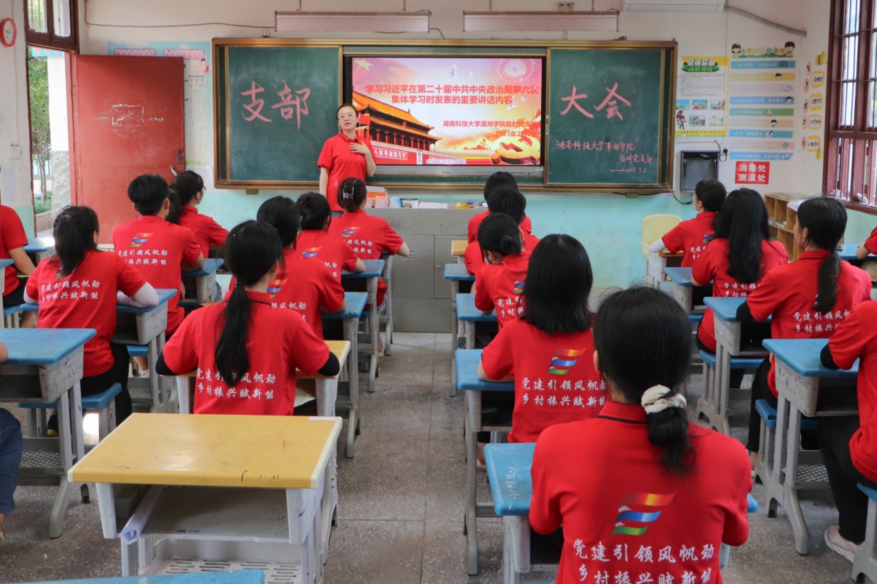 为深入学习贯彻习近平新时代中国特色社会主义思想,充分发挥党组织战斗堡垒和党员先锋模范作用,努力将学院学生培养成为担当民族复兴大任的时代新人,7月2日下午,beat365官网于湖南省怀化市通道县木脚完全小学观看习近平在第二十届中共中央政治局第六次集体学习重要讲话内容视频。学院暑期“三下乡”实践团临时党支部全体成员共同观看。