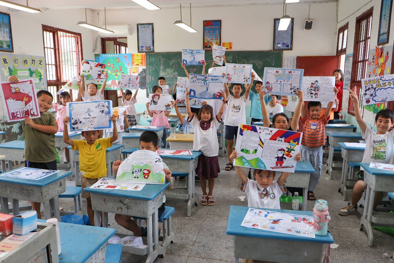 跟随宣讲队一同而至美丽木脚的还有beat365唯一官网的大学生们为少年孩童们精心制作的一幅幅奥林匹克体育精神主题手抄报,别出心裁的构图排版、色彩斑斓的拼贴图案、惟妙惟肖的卡通形象、俊秀隽美的文字笔法和天真烂漫的质朴乡娃欢声笑语相映成趣,构成了传遍村舍的天籁妙音、唯美画卷,哥哥姐姐们的画报赠礼助力少年孩童心中奋力拼搏的火炬燃起,象征五大洲各国青年人团结友好、齐聚一堂的运动盛会奥运五环悄悄在少年心中升起。