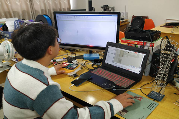 从大学生节能减排竞赛开始,信心满满的他屡遇困难:没有队友、没有人脉、没有研究实验室等等。而在他进入实验室之后,同样困难重重,基础薄弱、专业知识有限等。张健为了赶上同级的优秀同学,每天都是寝室、教室和实验室三点一线生活。在准备2019年全国电子设计大赛时,他放弃暑假回家休息时间留下来学习备赛,有时候直接睡在实验室,甚至是通宵钻研。在谈及是否有想放弃过的念头,他坦言道:“当然有。但是每当想起曾老师,半夜三点秒接收我们发去的文档,并在凌晨五点回复给我们修改好的文件时,就没有想放弃的念头了,老师还时常鼓励我们,当我们遇到了技术瓶颈,他第一时间指导给我们。而且自己的队友也没有放弃,况且我还是队长,大家相互支撑,相互成长,所以我更是没有理由去放弃了。”