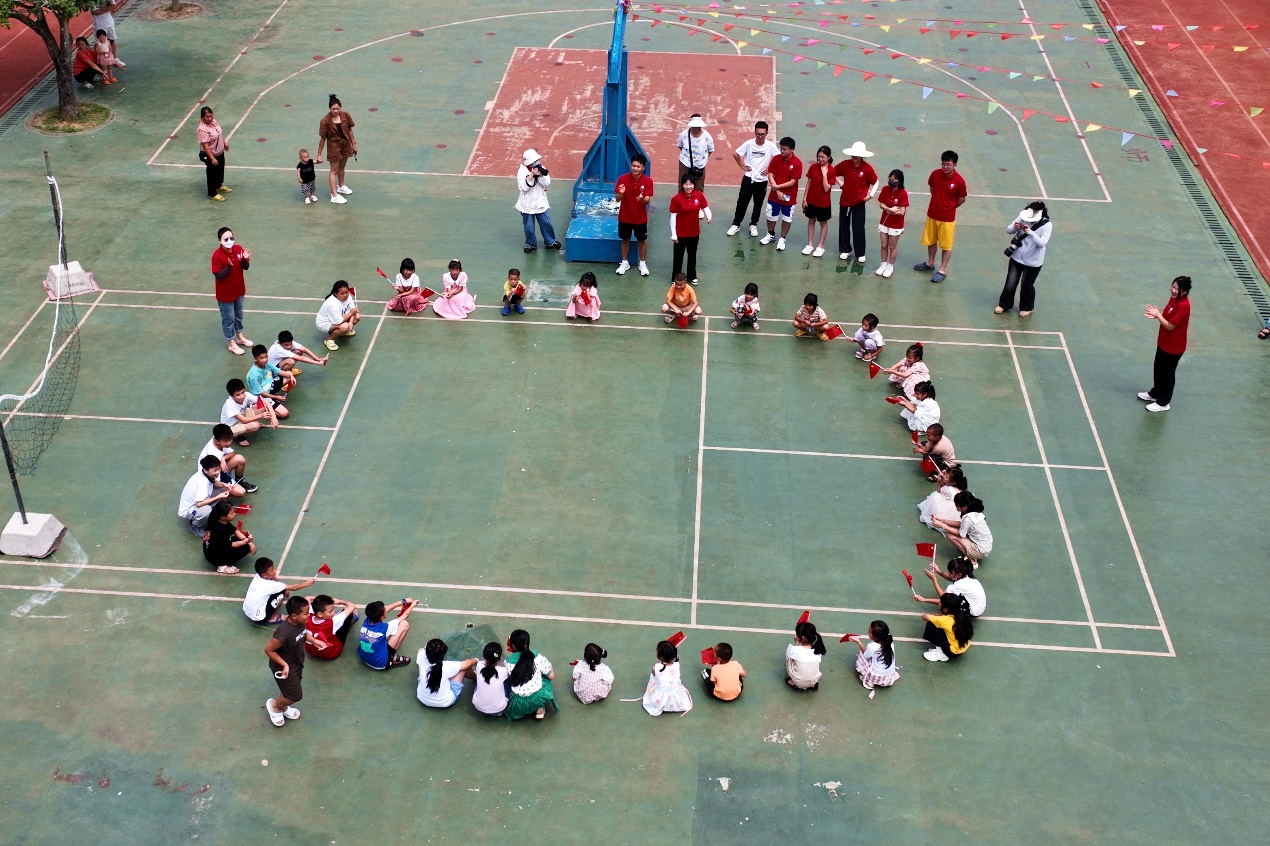 最后,为让学生们尽快熟悉环境、了解彼此,实践团在罗茜介绍了游戏规则后,带领孩子们齐聚操坪中心、围坐一圈,开展摇旗丢手绢游戏。“丢手绢”的歌声飞扬于木脚完全小学乃至周围的山谷溪涧,红旗也随孩童们的欢声笑语在他们的手中飘扬,一场场追逐战惊险刺激又妙趣横生,部分前来看望孩子的家长也笑容满面,倍感欣慰。五轮的游戏时光幸福而又短暂,许多小朋友表示非常期待接下来筑梦课堂的多样课程。