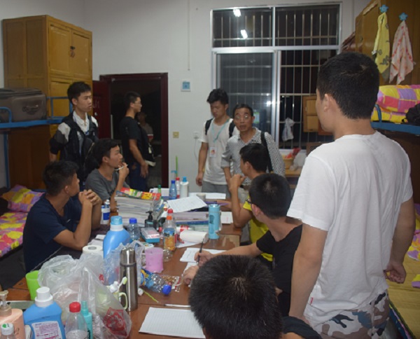 院长禹旭才及辅导员杨凤娥、廖九英老师首先走进了八区五栋女生宿舍楼深入寝室了解情况,期间与新生们亲切交谈,仔细询问新生的生活起居和学习情况,并对反映有硬件设施问题的寝室进行了仔细检查,并嘱咐随行人员进行登记汇总,向上汇报情况,强调要让新生感觉到重新回到家的温暖。
