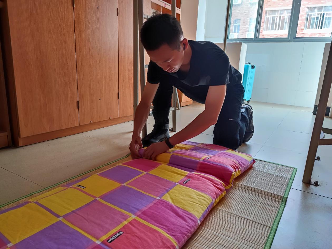退役军人们来到新生宿舍当起“叠被子”的小老师。“我们先把被子铺平,再用力压实,这样抽掉被子里的空气有利于叠成‘豆腐块’。”,退伍军人们正详细讲解叠被子的技巧。铺平、压实、翻折、捏线,退役军人们一丝不苟、一气呵成,且倾囊相授“豆腐块”秘诀,使得现场响起阵阵掌声。随后,同学们认真练习,一边请教一边调整,场面热火朝天。