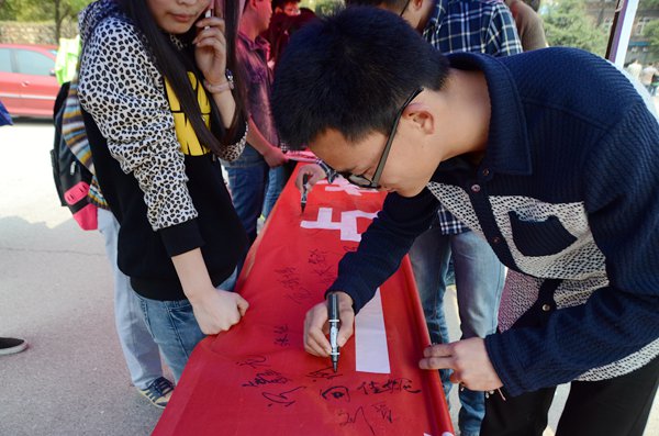 3月18日,beat365官网于美食广场前开展了戒烟签名活动,活动由校风督察部与青年志愿团联合承办。一幅巨大的戒烟标语刚铺在摆点处,就吸引了众多同学自发前来签名,其中不乏很多女生。一位女生和她的男友在横幅上签下了俩人的名字,她说,她多次劝告男友戒烟都没有效果,这次赶上学院戒烟活动她是铁了心要让男友成功戒烟。当天,共有800余名同学在戒烟横幅上签名。