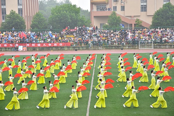 在运动员代表张俊东,裁判员代表唐宁潇宣誓后,精彩的文艺表演在同学们的欢呼声中如约而至。由近200名科大教职工组成的舞蹈队为全校师生带来了一场大型扇子舞表演《红烛》,拉开了本届运动会开幕式表演的火红序幕,演绎着如诗如画的美丽,他们伴随着悠扬的节奏挥舞着鲜红的红扇,她们的每种动作都在诠释着教师们的奉献精神,如同“红烛”般照亮他人,奉献自己,展现了科大教职工自信的风采。艺术学院的大型舞蹈节目《湘楚大地谱新章》那历经传承的湘潭油鼓,激起了我们撸起袖子加油干的热血;洁白的荷花,彰显出这一方山水的人文底蕴;金色的翅膀,绘就了科大学子在学海中展翅翱翔的风貌。商学院的团体操表演《希望》舞动青春、彰显活力,点燃了现场的气氛。体育学院的龙狮表演更是使现场气氛达到高潮,金龙将红狮围绕在中心为欢迎来宾之意,龙狮摆出爱心形状为爱我中华之意,五龙组成五环意为将奥运精神传承发扬,最后摆成“中,国,龙”三字则是预祝更好的发扬中国体育精神。