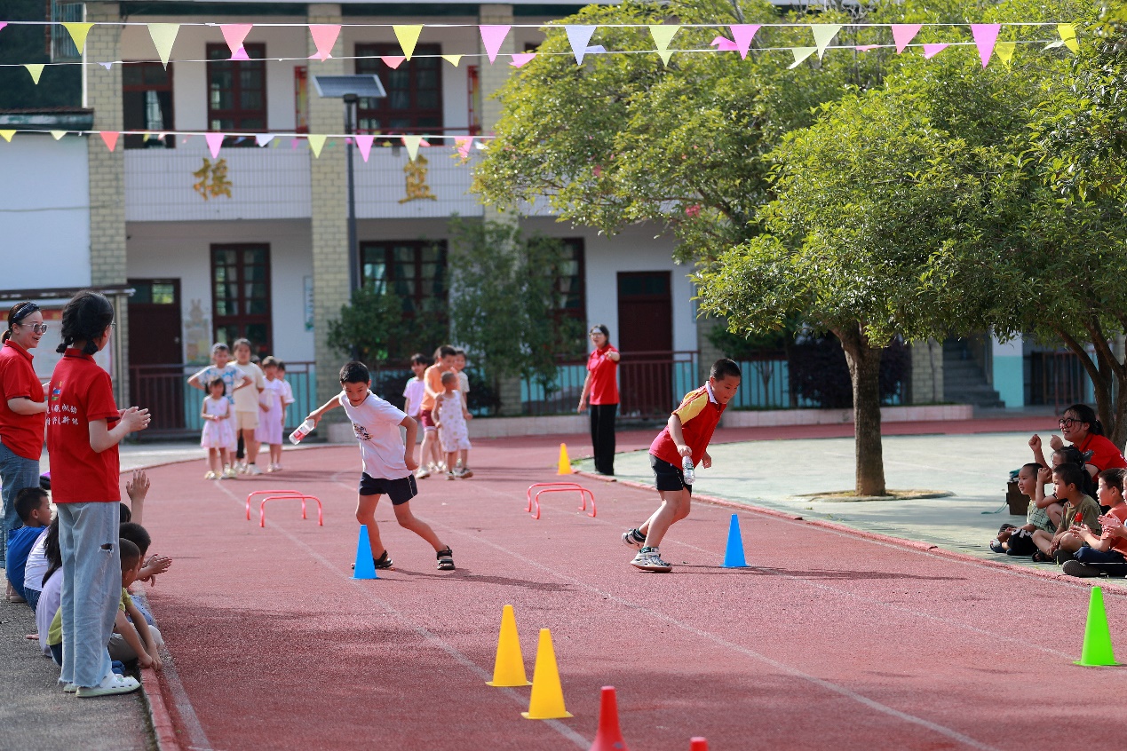 障碍赛上,志愿者陈冠以小组为单位组织接力比赛,通过跳、绕、跨、跑等障碍项目完成最终接力。比赛开始,各组选手卯足了劲向前冲,绕过标志桶、跨过栏杆、跳过绳梯,迅速跑回起点与下一位选手传递接力棒接力。小小的身躯蕴含着大大的能量,他们你追我赶,奋力奔跑,竞争虽然激烈,但却井然有序。操场上快乐的奔跑,有的激动的呐喊助威,此起彼伏,热闹非凡。
