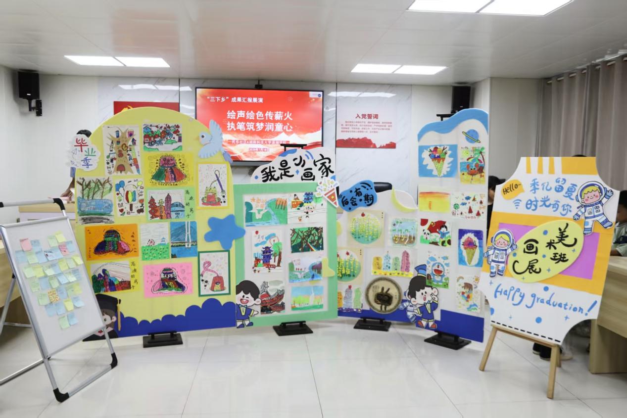 舞台周边,为期10天的实践成果展同样吸睛:绘画作品《万楼》以童趣笔触勾勒家乡风貌,简笔画描绘纯真想象;红色手工作品区,孩子们制作的党旗、红军小战士模型等匠心独具,稚嫩的文字卡片上写满对革命先辈的敬意。一幅幅作品、一件件手作,凝结着“三下乡”活动中孩子们的成长印记,也展现了实践团“以美育人、以文化人”的扎实成效。